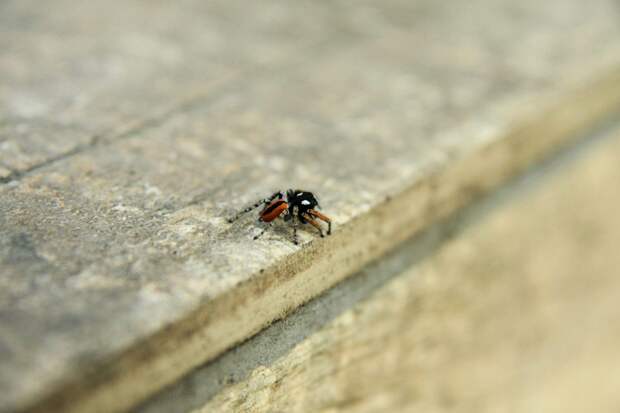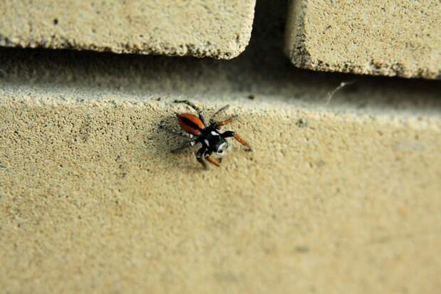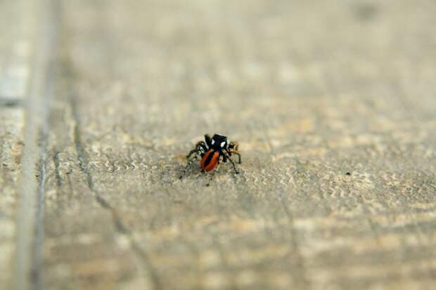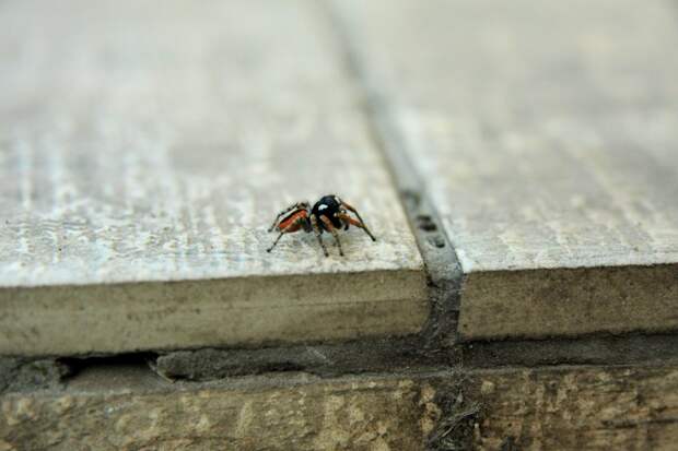 Кстати, размер взрослых особей, это ещё один рекорд вида. В семейство пауков-скакунов очень малорослое. 5-6 мм, это обычный размер для них. Некоторые настолько мелкие, что их без увелечительного стекла сложно увидеть, не то что рассмотреть. И на фоне остальной семьи, P. chrysops кажется гигантом.